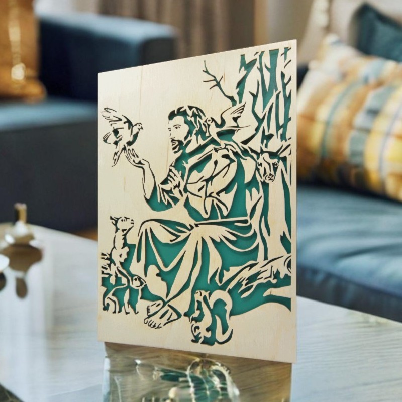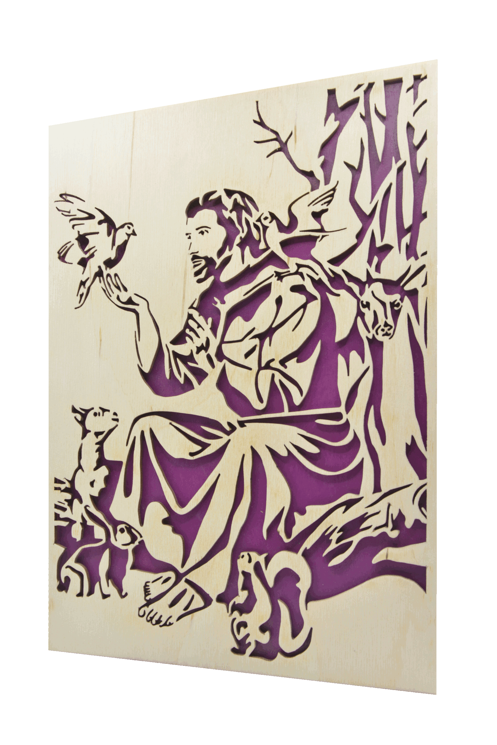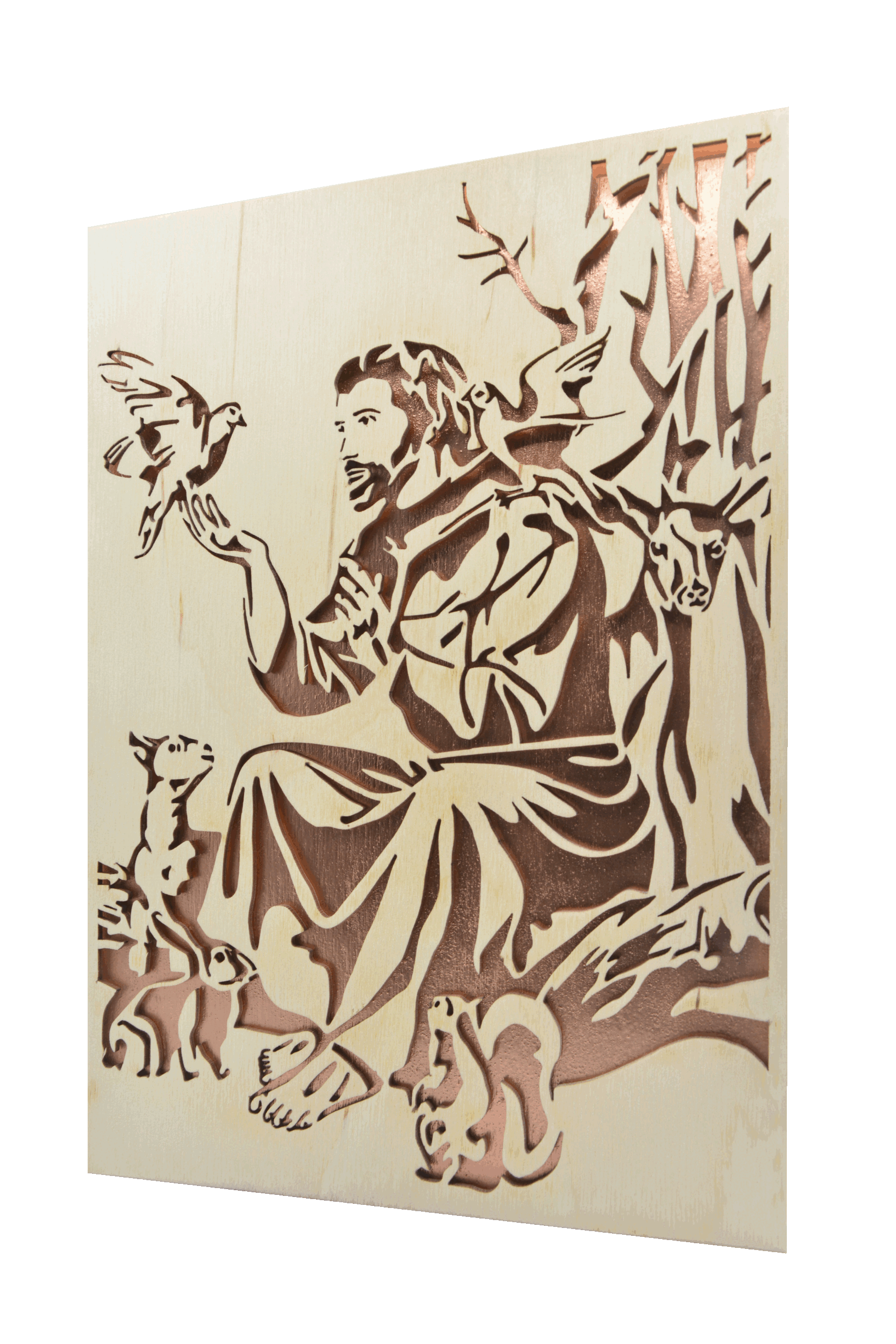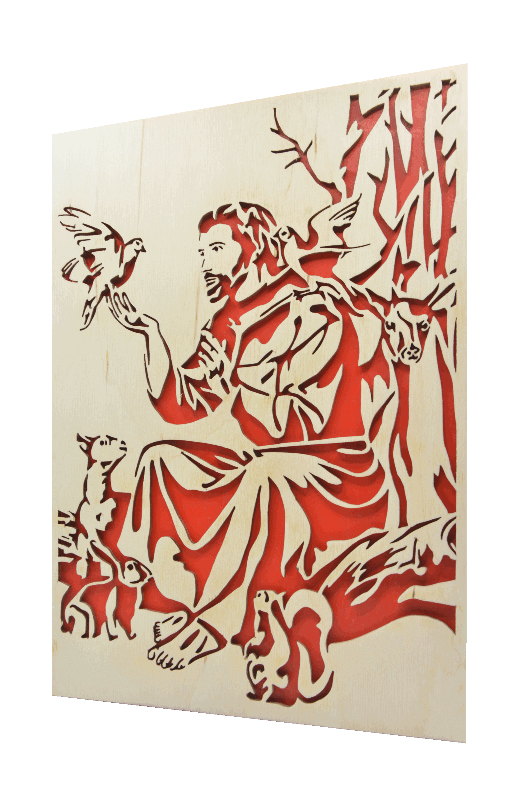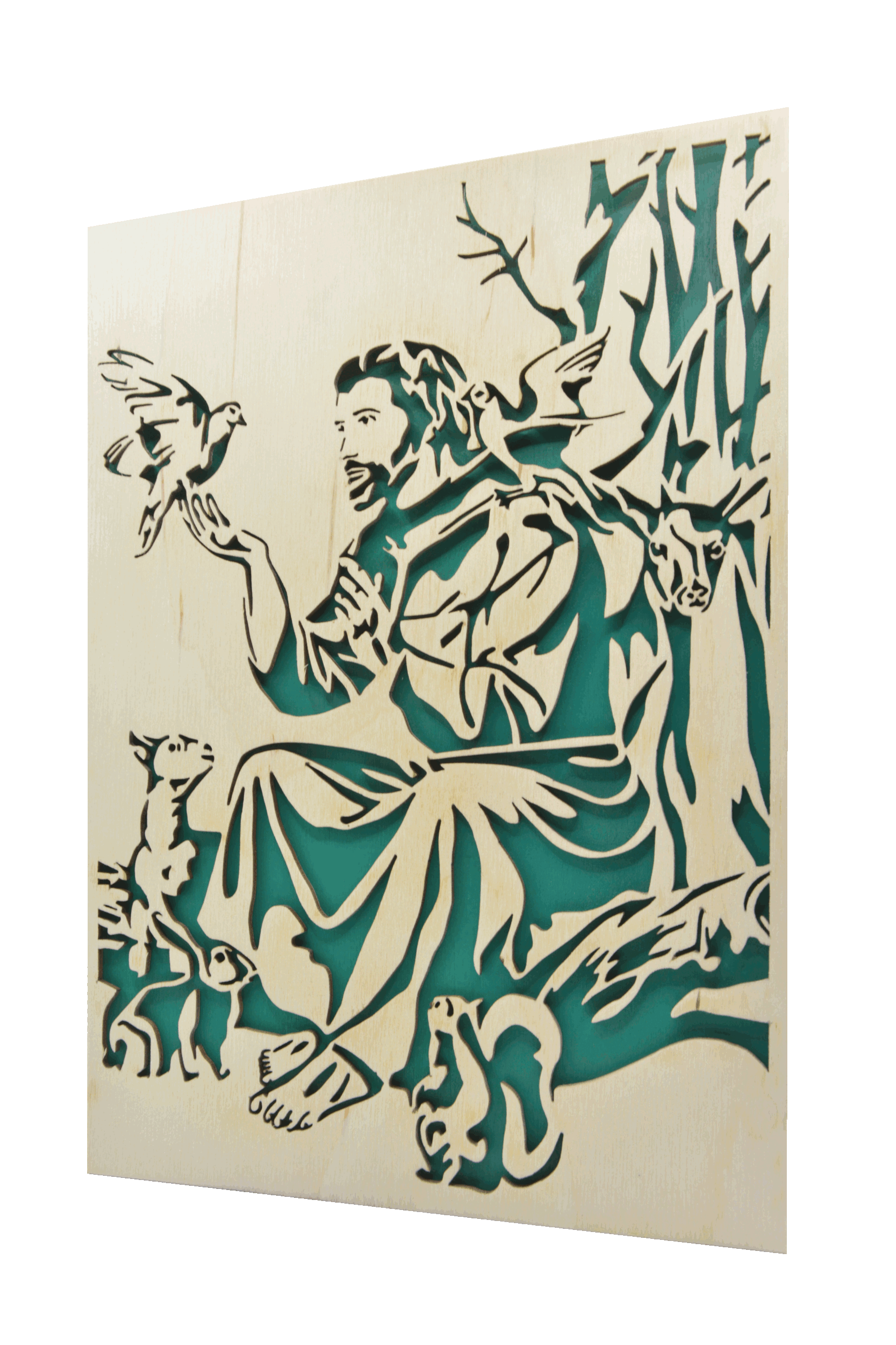 Vyřezávaný obraz sv. Františka z Assisi přináší unikátní spojení tradice a moderní techniky. Dvě vrstvy březové překližky (3 mm) umožňují elegantní barevné varianty. Grafický návrh pochází z dílny našich grafiků a je chráněn autorskými právy.