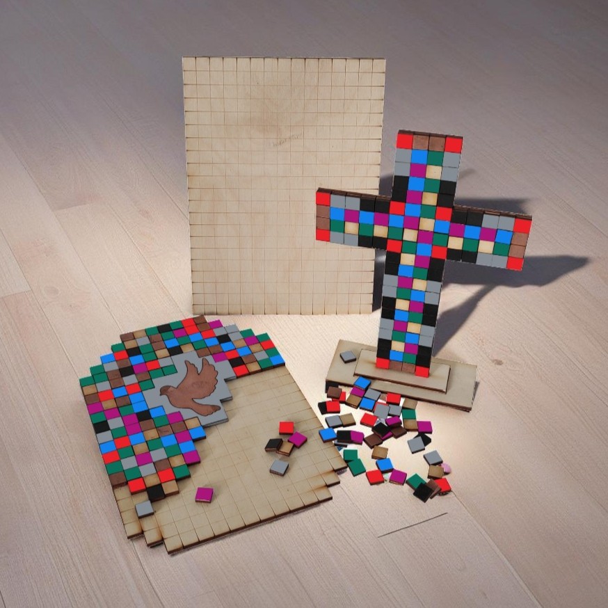 Tato dřevěná mozaiková sada přináší nejen kreativní zábavu, ale také možnost vyjádřit víru a duchovní symboliku skrze barvy a tvary. Díky jednoduchému principu lepení mozaikových kamínků si může každý vytvořit jedinečný kříž, obraz holubice nebo jiný motiv, který lze pověsit na zeď nebo postavit na stůl.