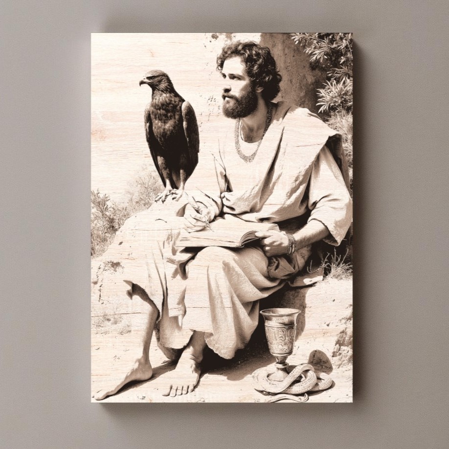 Gravírovaný obraz svatého Jana Evangelisty působí jako tichá kontemplace – mladý apoštol, ponořený do psaní, sedí v stínu skal, zatímco vedle něj bdí orlice – symbol ducha, výšky a Boží inspirace. Kniha v jeho rukou, pohár u nohou i had, který se pod ním plazí, vyprávějí příběh světla, které nezhasíná.