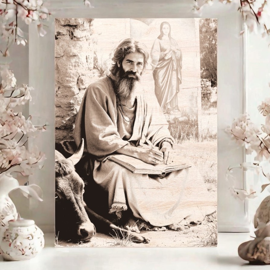 Gravírovaný obraz svatého Lukáše, evangelisty a patrona lékařů a umělců, zachycuje tohoto světce v okamžiku inspirovaného psaní jeho evangelia. Na 8mm bukové překližce vynikají jemné detaily Lukáše s knihou a perem, doprovázeného býkem – symbolem oběti a síly víry.