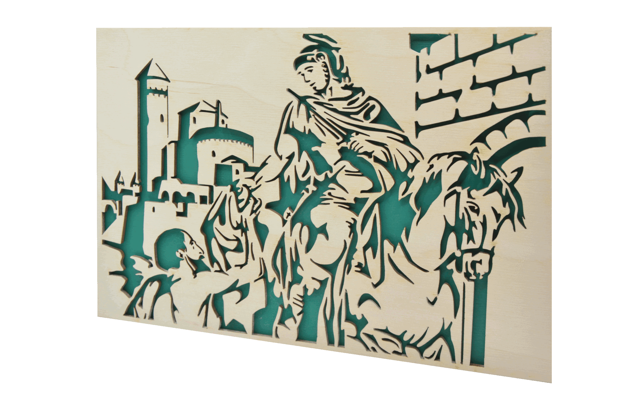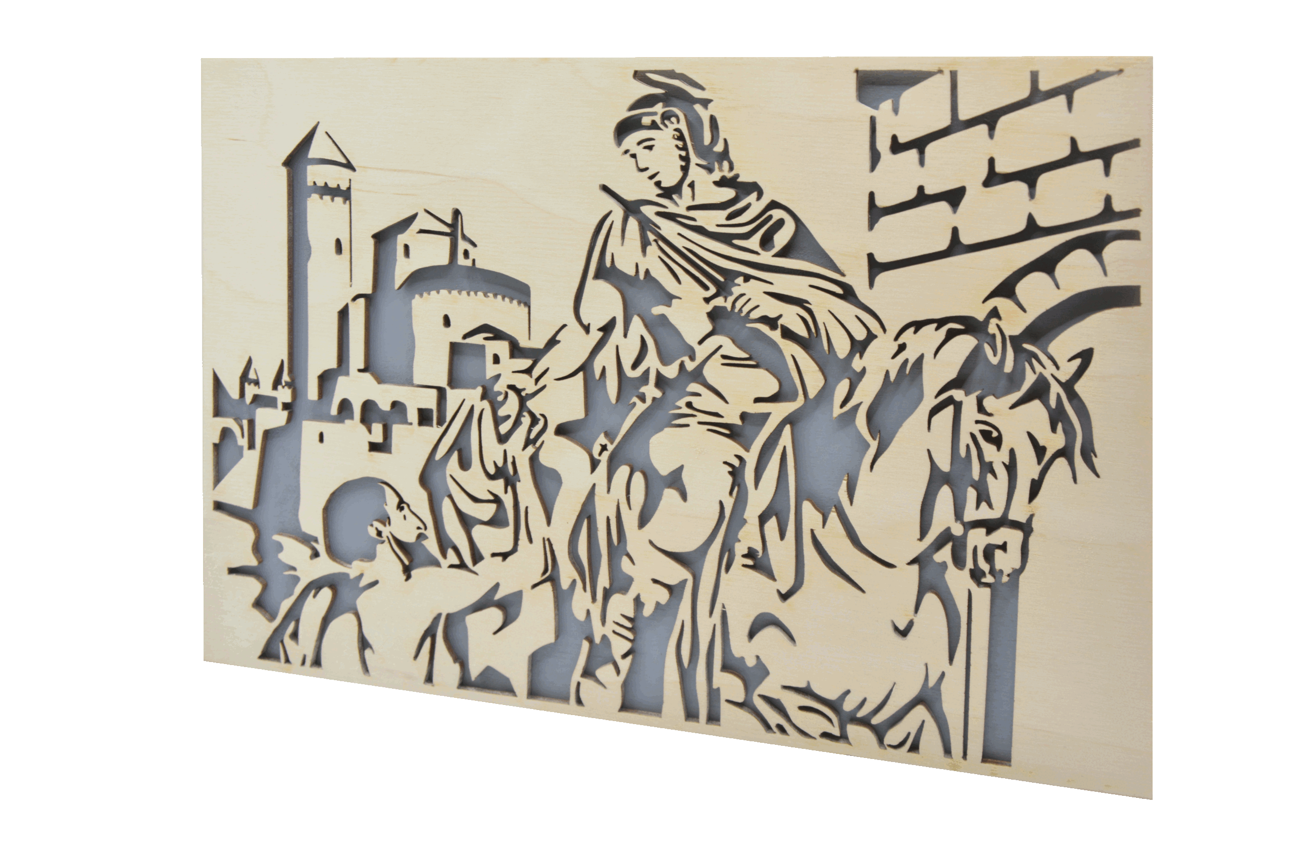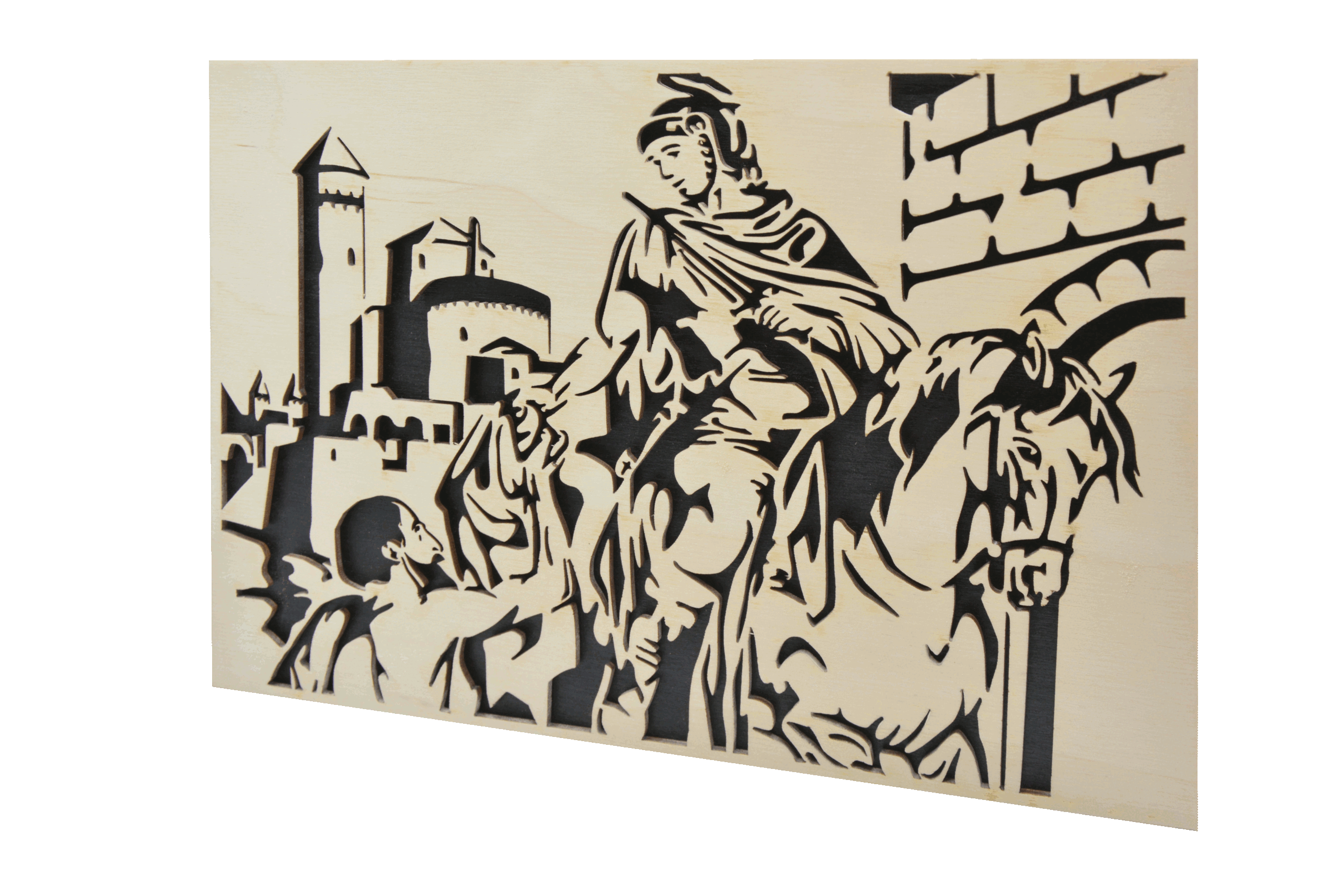 Sv. Martin je jednou z nejznámějších postav křesťanské tradice. Voják, který se rozhodl sloužit Bohu, a muž, který dokázal jednoduchým gestem – rozdělením svého pláště – změnit život potřebného. Tento vyřezávaný obraz zachycuje jeho odkaz v minimalistické, ale výrazné podobě.