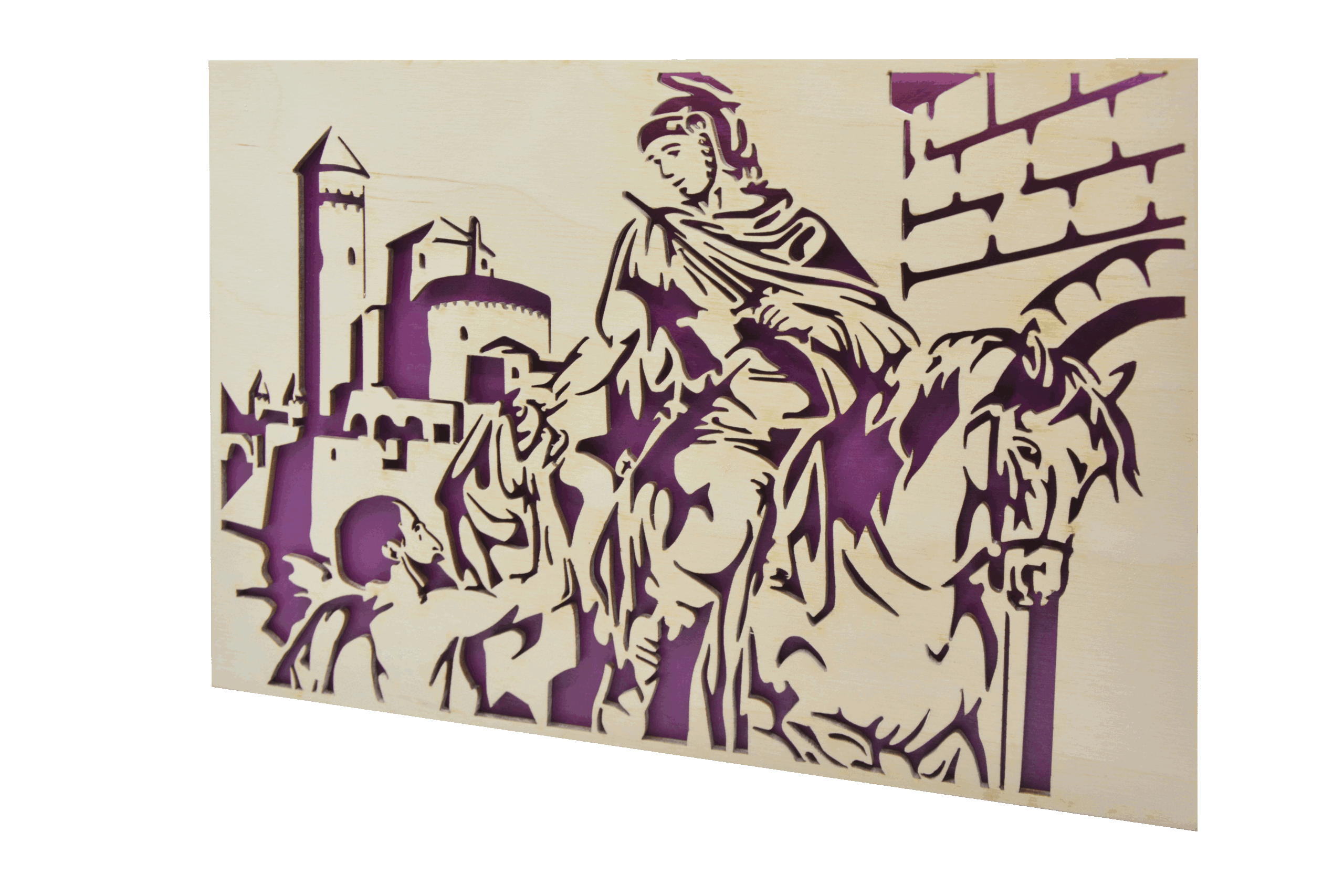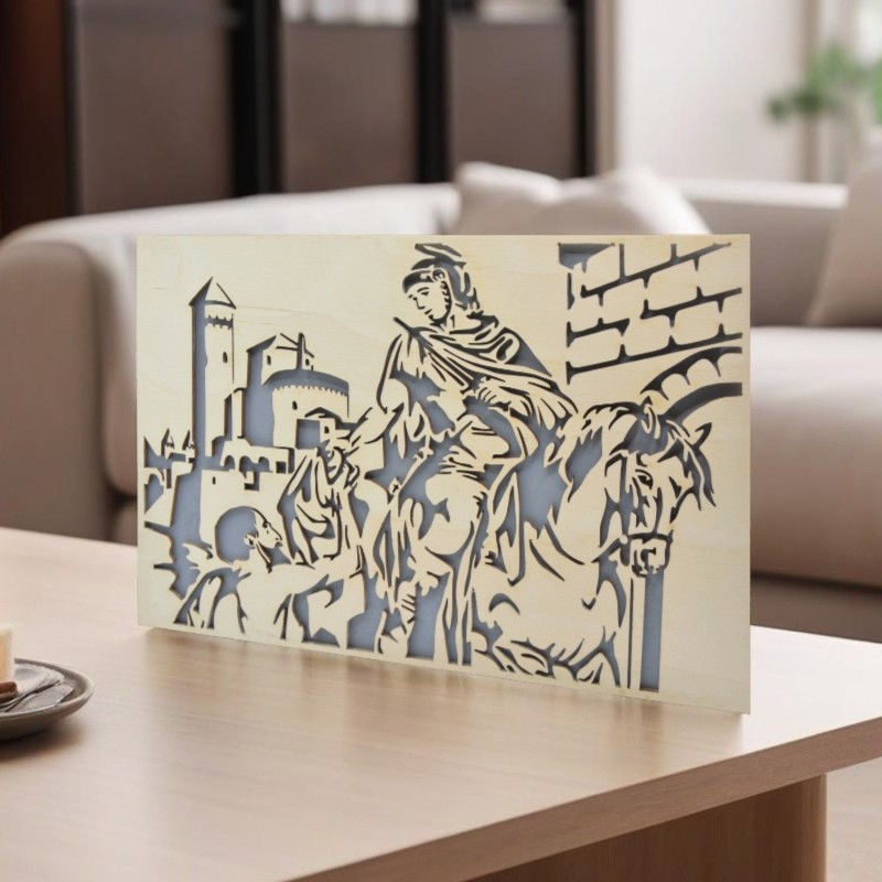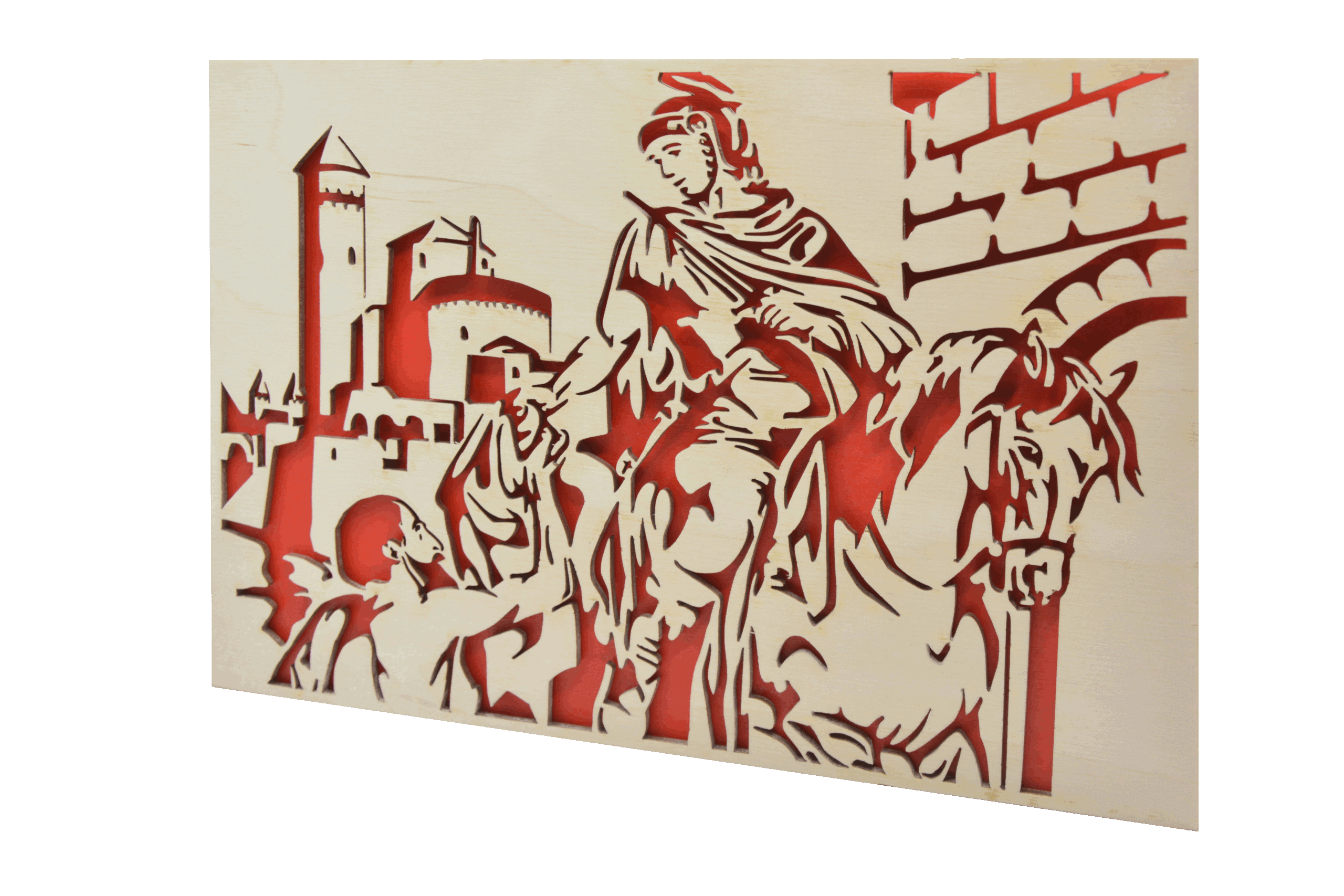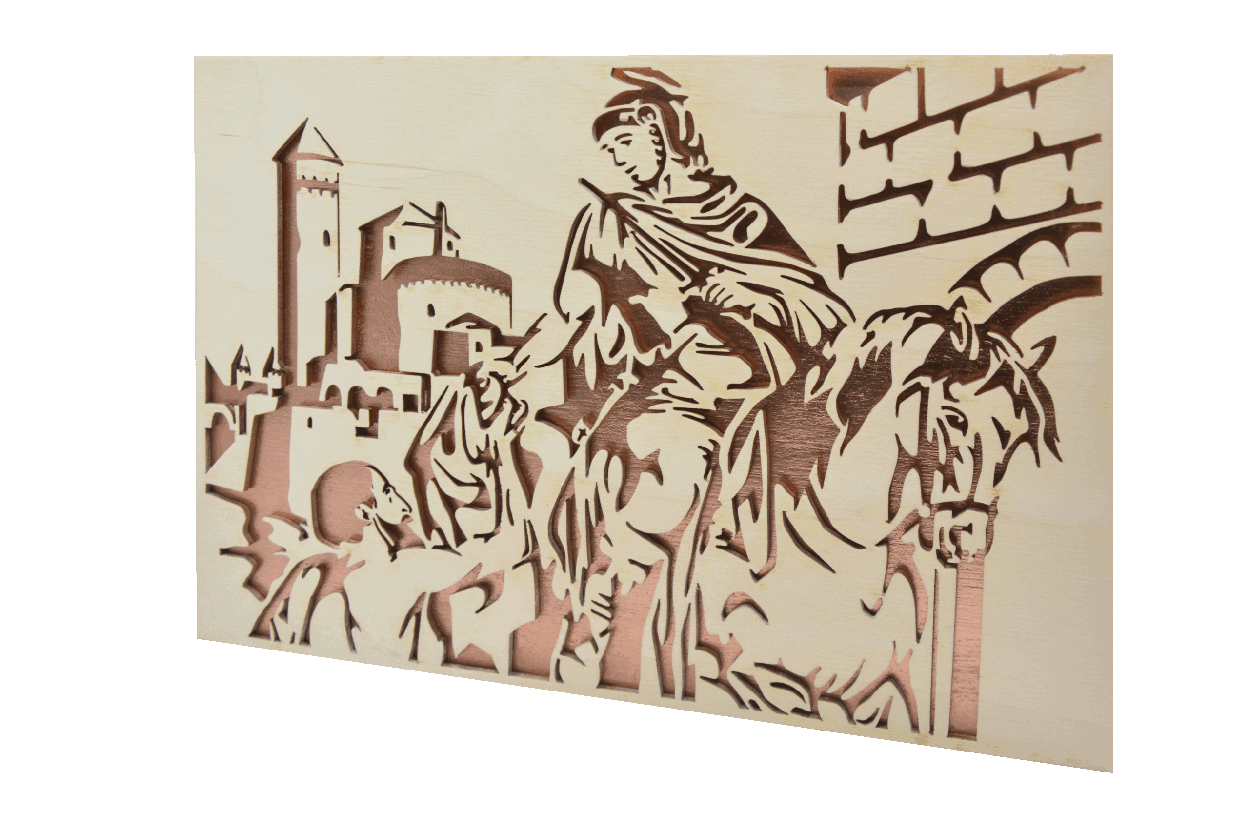 Sv. Martin je jednou z nejznámějších postav křesťanské tradice. Voják, který se rozhodl sloužit Bohu, a muž, který dokázal jednoduchým gestem – rozdělením svého pláště – změnit život potřebného. Tento vyřezávaný obraz zachycuje jeho odkaz v minimalistické, ale výrazné podobě.