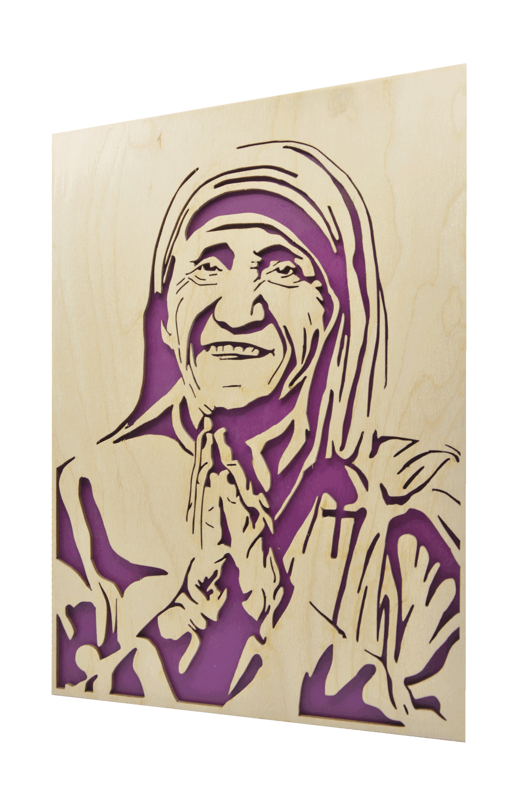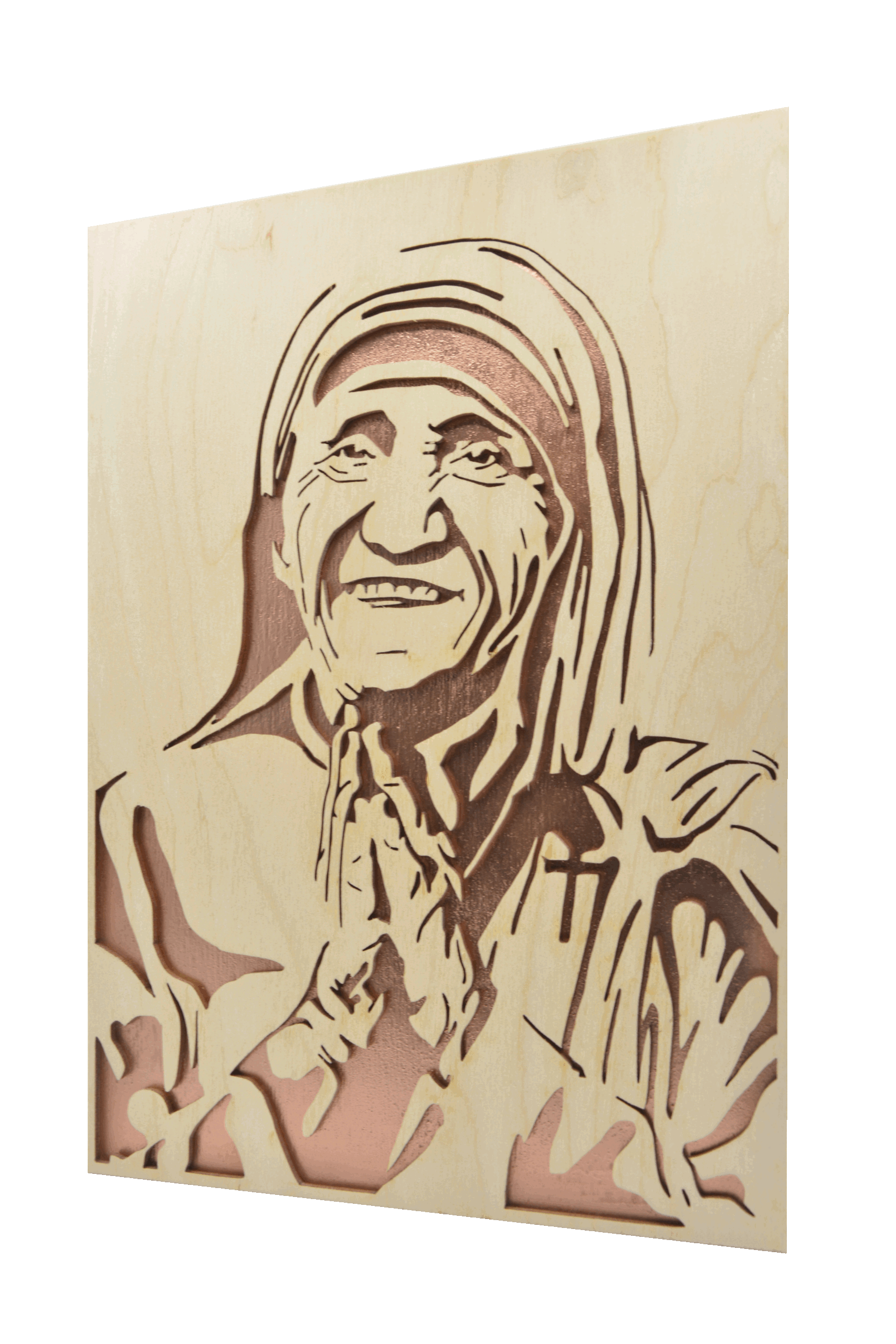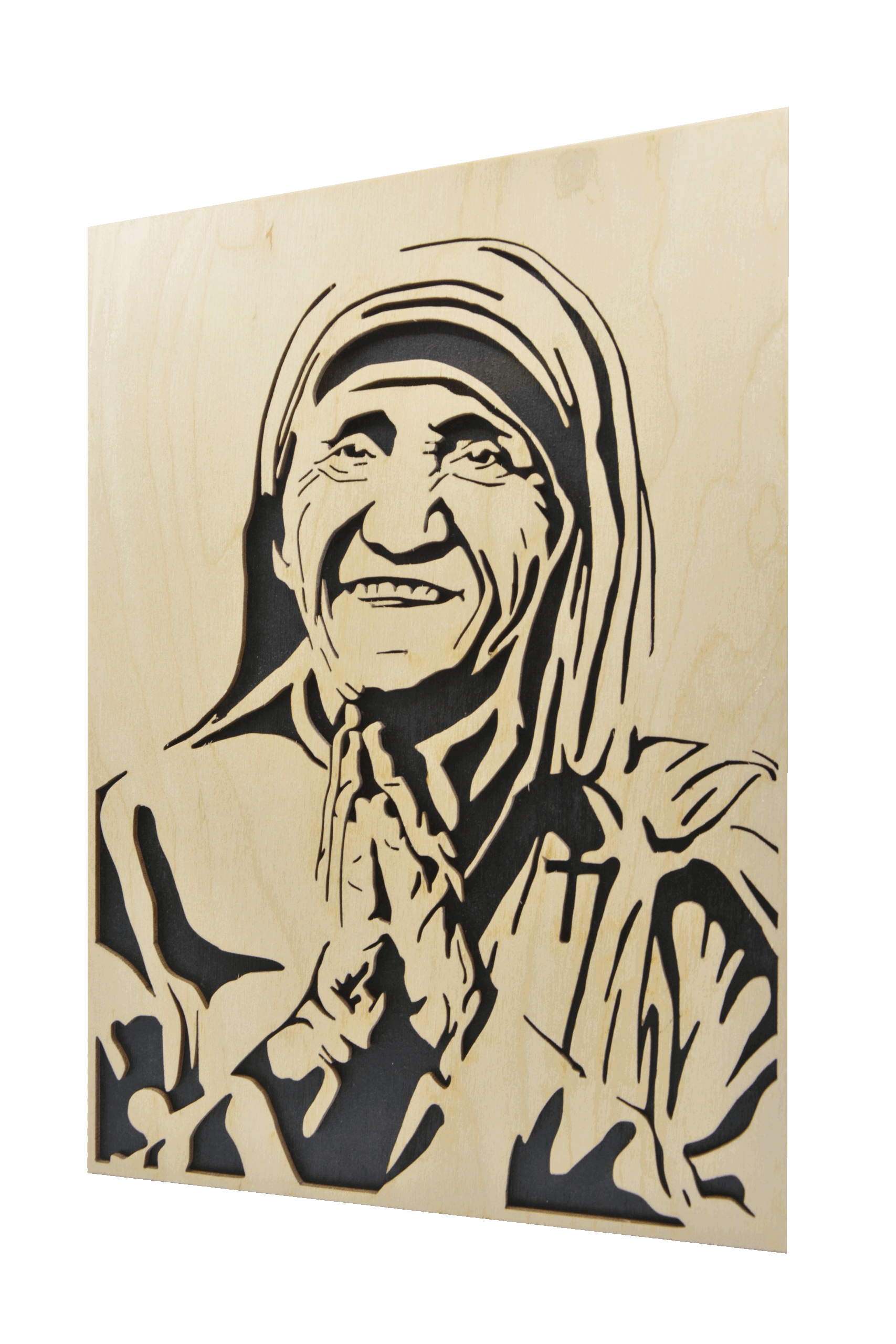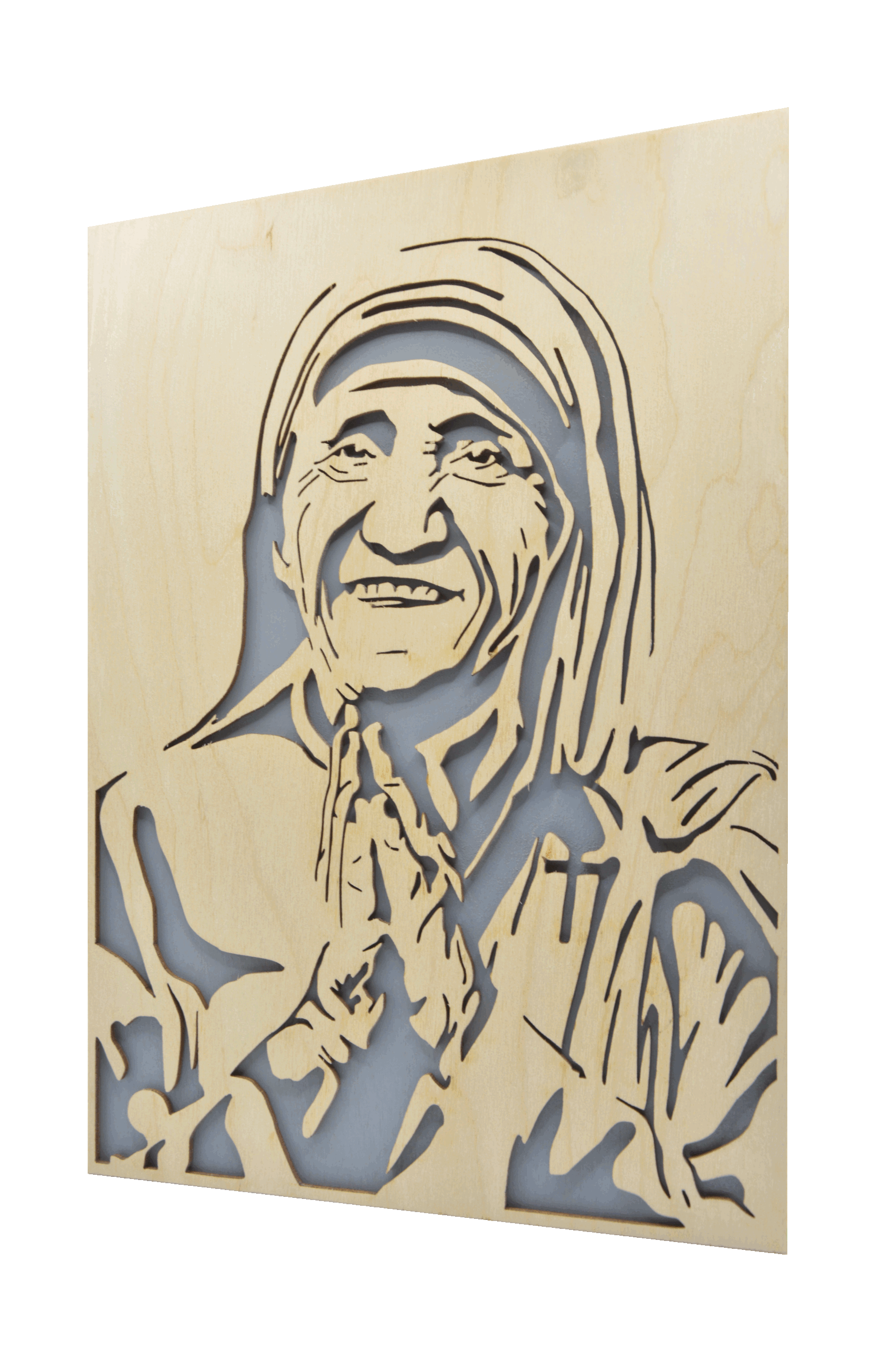 Obraz je vytvořen precizní technikou vyřezávaného reliéfu ze dvou vrstev březové překližky, což mu dodává jemnost a hloubku. Díky kontrastnímu provedení vystupují rysy Matky Terezy s neobyčejnou čistotou, ať už zvolíte decentní šedou nebo sytější barevné varianty.