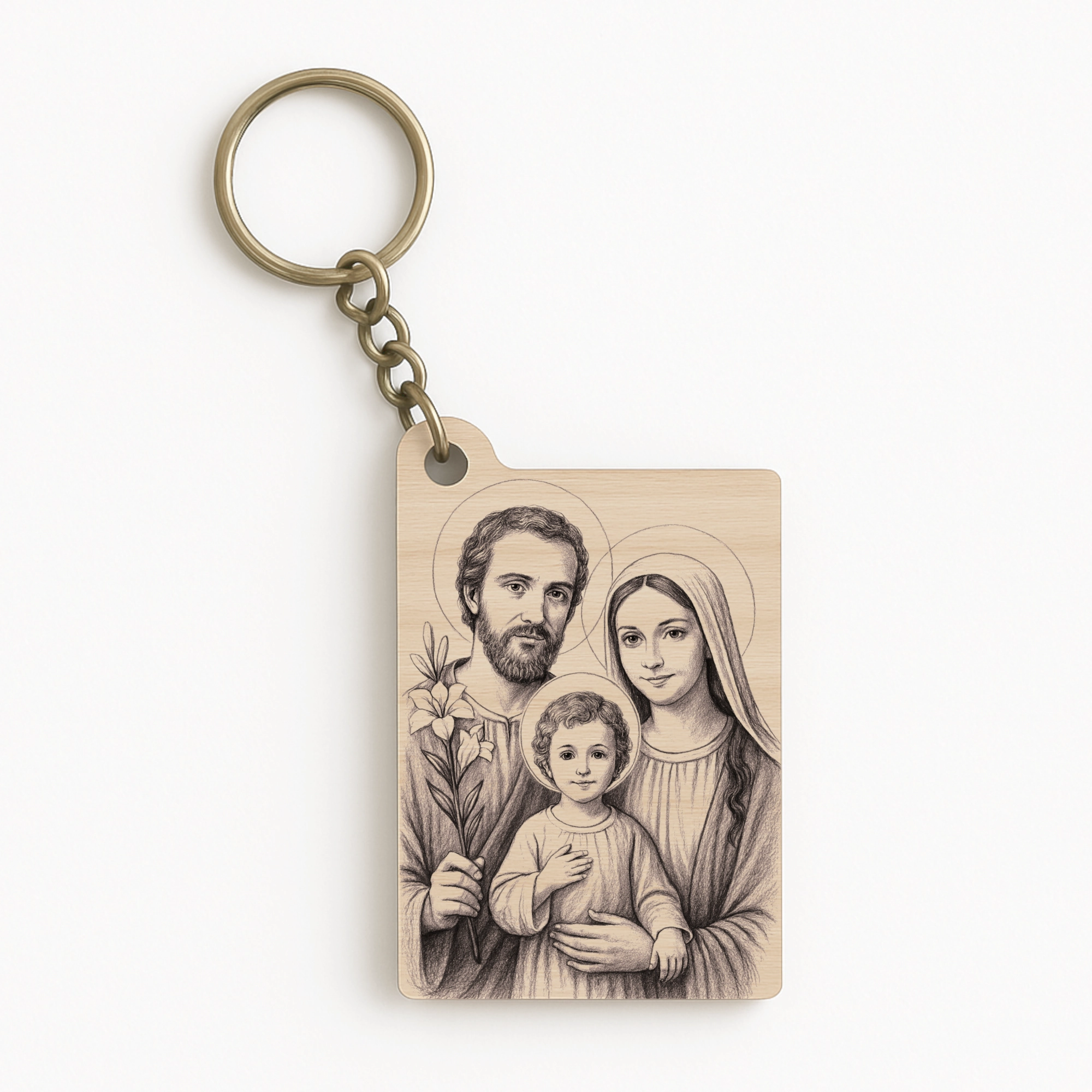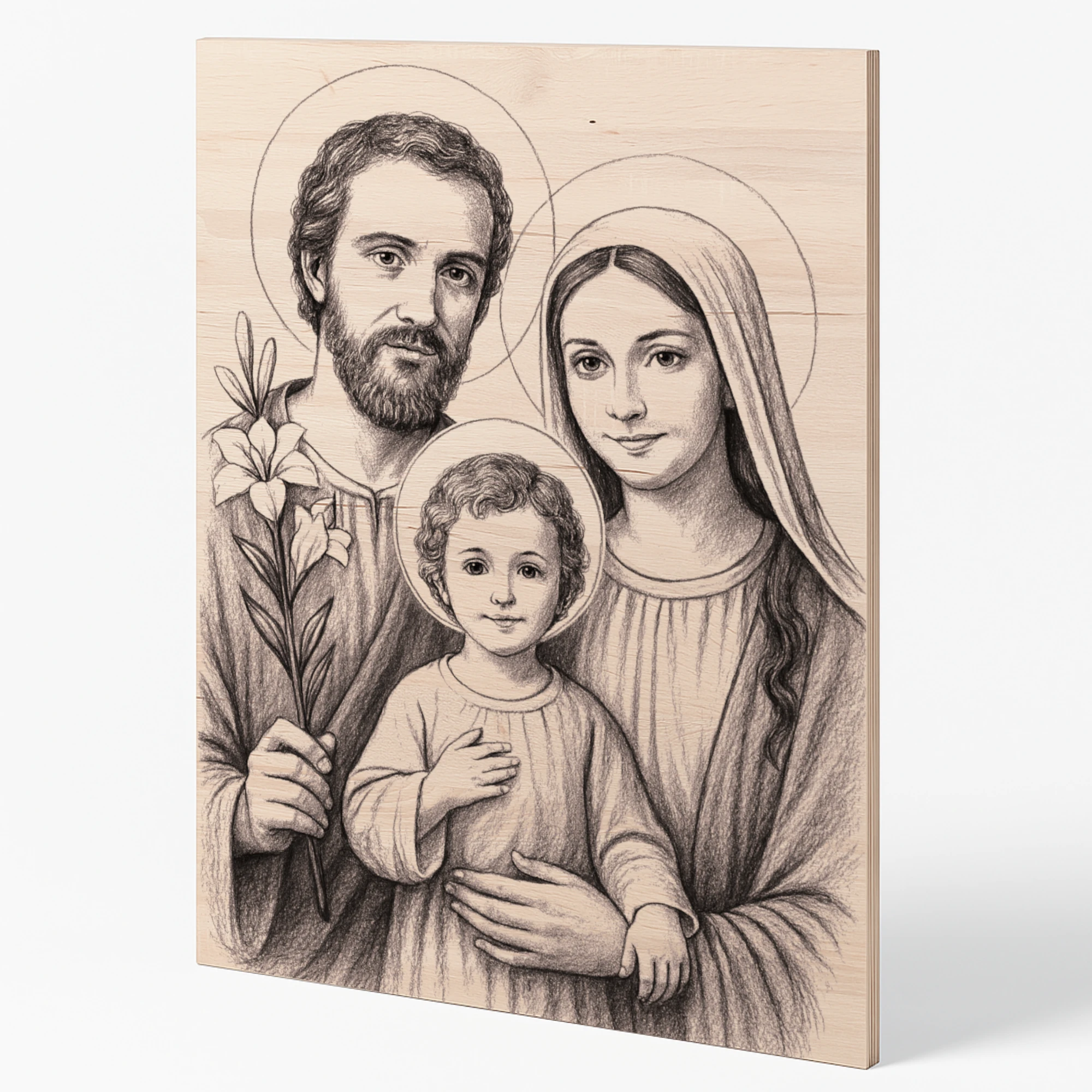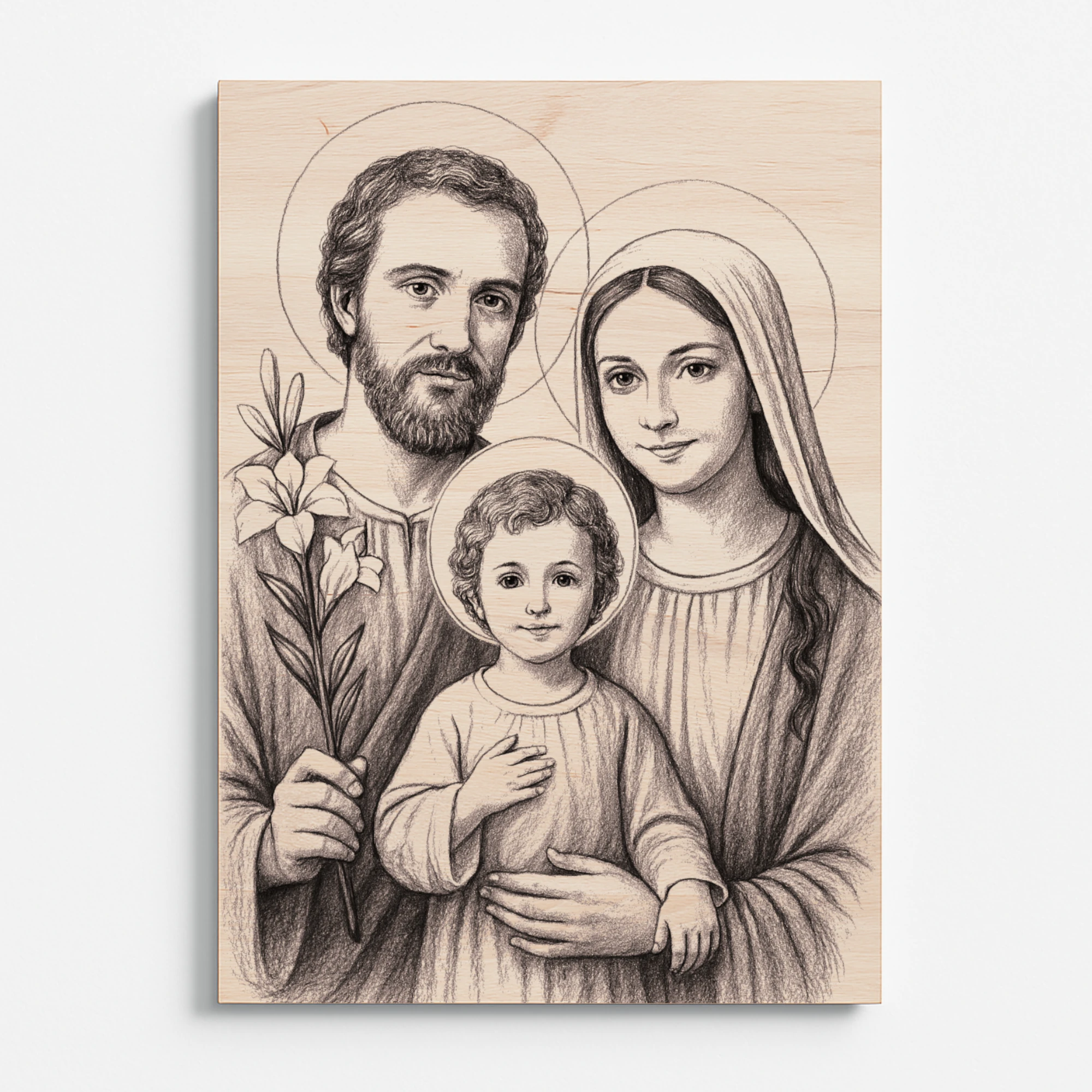 Vygravírovaný obraz Svaté rodiny – Ježíš, Panna Maria a svatý Josef na bukové překližce, čelní pohled.