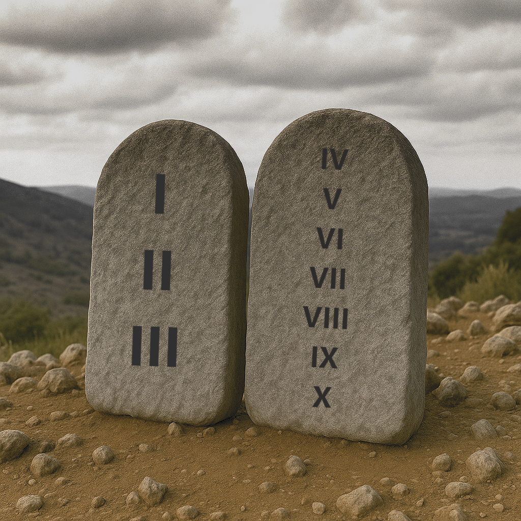 Dvě kamenné desky s vytesanými římskými čísly představující Desatero Božích přikázání, položené na kamenité zemi v horské krajině pod zataženou oblohou.