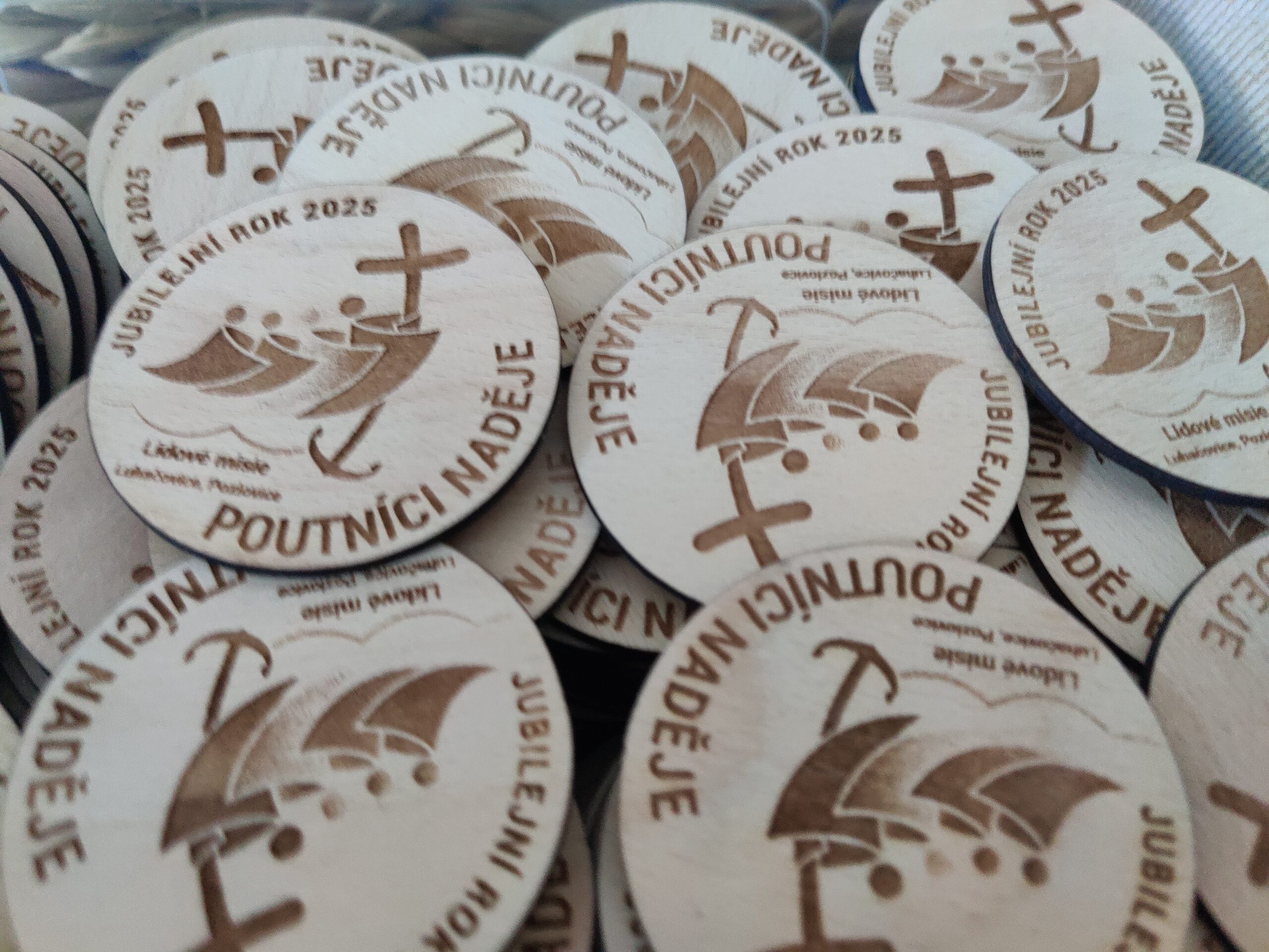 Na fotkách můžete vidět hotové produkty. Prvním z nich jsou dřevěné magnetky o průměru 8 cm, na kterých je vyryté logo jubilejního roku 2025 a nápis „Poutníci naděje“. Design je jednoduchý, ale vyjadřuje podstatu tohoto významného roku. Dalšími produkty jsou větší dřevěná kola o průměru 40 cm, která mají sloužit k pověšení do kostelů. Tato kola jsou pečlivě zpracovaná a jejich velikost i vzhled zajišťují, že se stanou výrazným prvkem v kostelních prostorech.