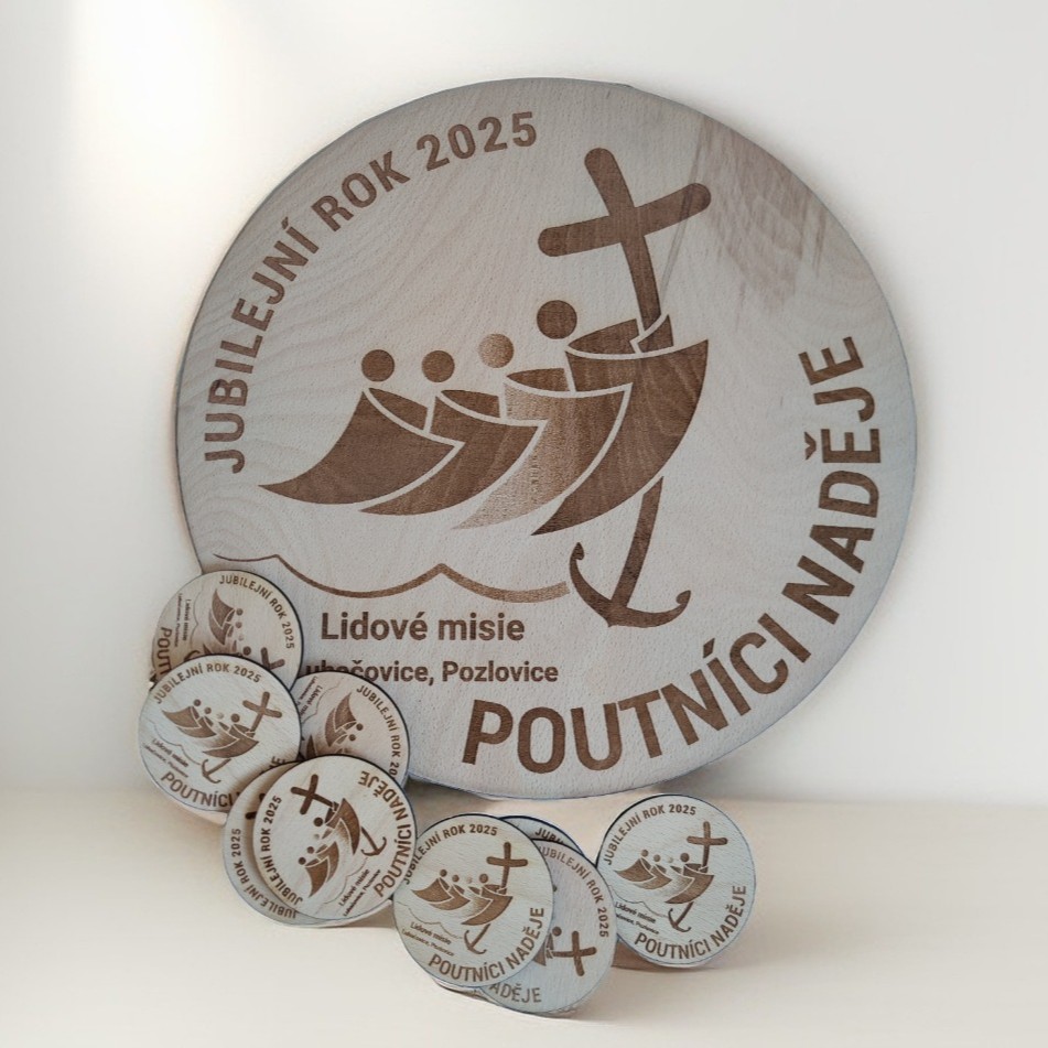 Zákazník objednal několik produktů, mezi kterými byly magnety o průměru 8 cm s logem jubilejního roku 2025 a vlastním nápisem. Kromě toho si objednal také několik větších dřevěných kol o průměru 40 cm, která mají být umístěna na stěny v různých kostelech. Tyto produkty byly pro nás příležitostí, jak se podílet na duchovním životě farností, a byly jsme rádi, že můžeme poskytnout něco, co bude součástí náboženského dění – je pro nás vždy velká čest, když některý z našich produktů, zaujme čestné místo v liturgickém prostoru.